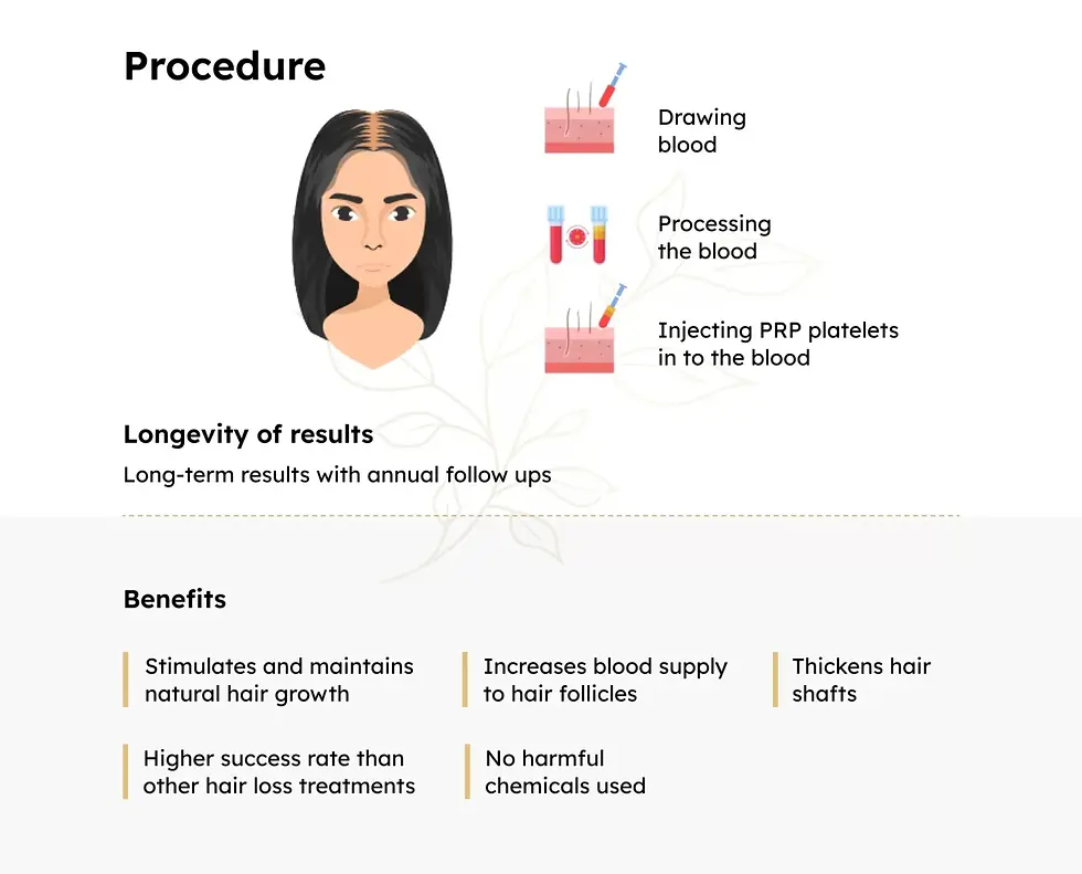 In this treatment, a small amount of the patient’s blood is drawn, processed in a specialized medical centrifuge, and the plasma enriched with growth factors is carefully injected into the scalp. This concentrated plasma contains 3–5 times more platelets than normal blood and is rich in healing proteins like: